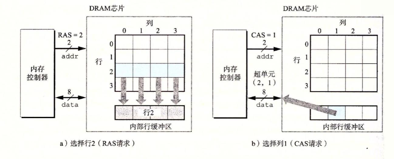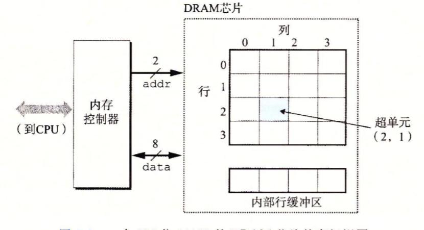 当读取一个超单元的信息的时候,内存控制器通过addr发送一个行坐标,然后DRAM芯片将整行的数据复制到内部行缓冲区。